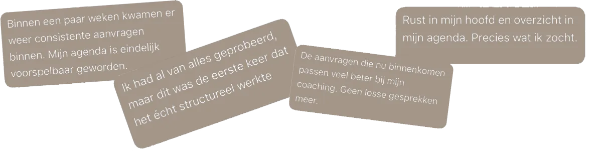 Met onze gerichte aanpak zorg je voor een consistente instroom van nieuwe cliënten. De methode wordt afgestemd op jouw niche en positionering, waardoor je aanvragen ontvangt van mensen met oprechte interesse. Ook als eerdere pogingen niet het gewenste resultaat opleverden, biedt deze bewezen strategie structuur en continuïteit. Zo bouw je aan een volle agenda en duurzame groei — maand na maand, ook in rustigere periodes.